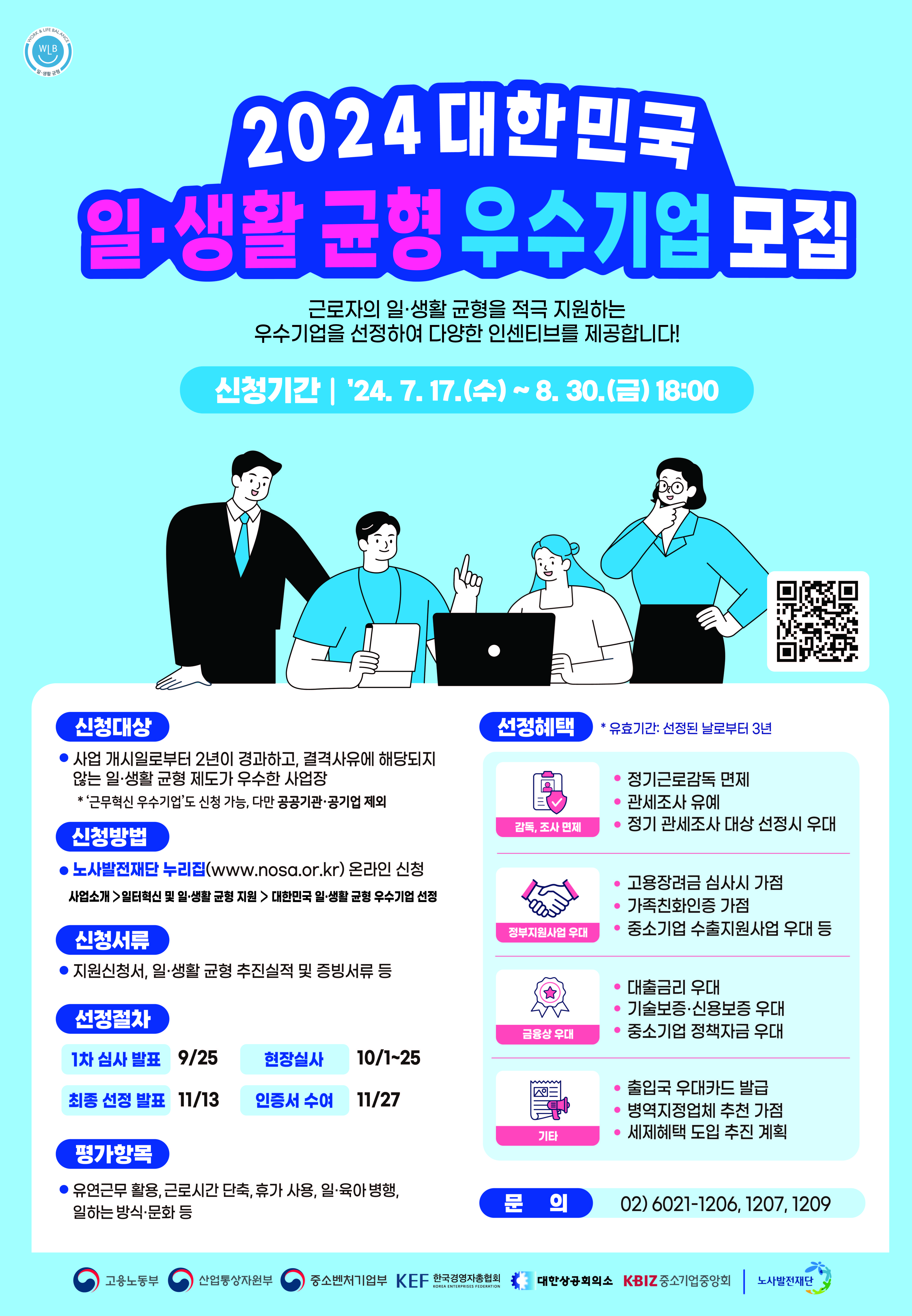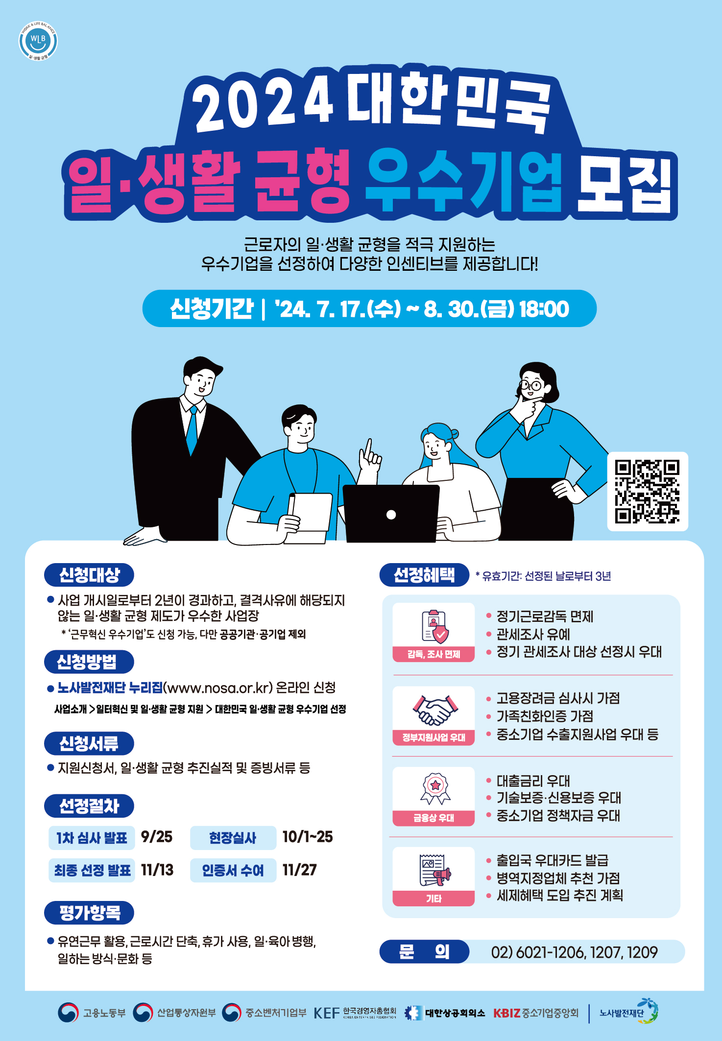 2024 대한민국 일·생활 균형 우수기업 모집 포스터입니다.(7.17.~8.30.)
